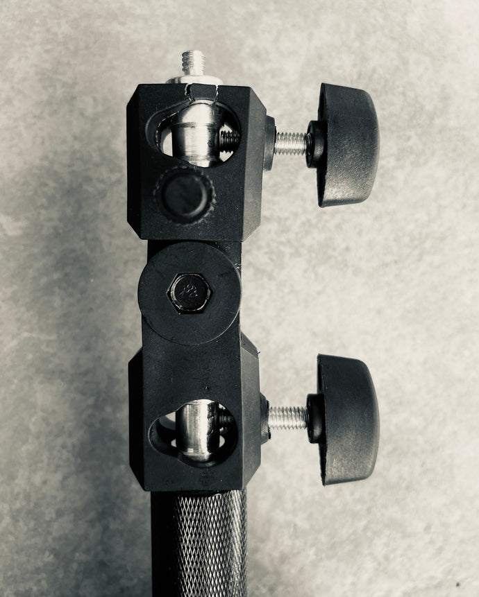 The handles are solid knurled metal for sure grip, and durability. Umbrella mount comes complete with studs that will attach to your lighting with a standard screw mount. Easily attach your video light or flash to this unique mounting device designed for the on location photographer. Umbrella mount can be angled 180 degrees.
